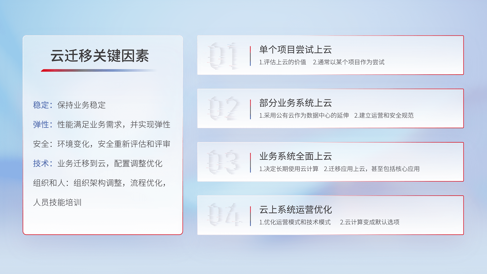 结合实际业务,,,从规划设计、、、、云平台选型、、云原生改造、、、、数据迁移、、集成交付,,,迁移全过程为客户识别最佳上云路径,,,,做好风险识别管理,,,设计网络架构、、身份权限、、、、安全审计合规、、、、操作审计、、、日志审计、、、监控告警策略、、多站点容灾设计等,,,对云上基础设施进行整体规划,,,,提升IT治理水平,,,,以满足弹性、、、、高可用、、高性能的需求。。。。