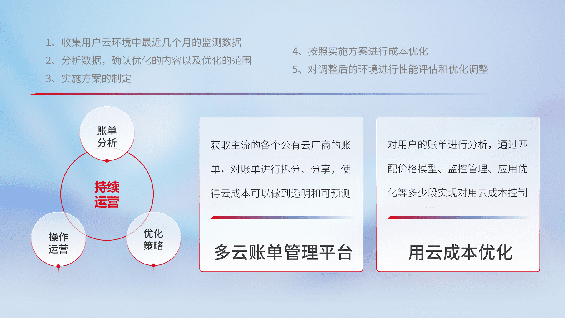 通过多云纳管,,,以统一的资源数据模型把客户的云资源进行抽象和封装,,,进而实现对多云资源的统一操作,,保障云资源管理的可靠性、、、稳定性与可用性。。。量身定制化运维内容,,,配置、、、、开发运维、、补丁管理、、、备份、、监控、、、、认证和访问管理、、、、审计和日常巡检等,,,,保障在用云过程中的可靠度,,,,稳定度以及高可用率。。